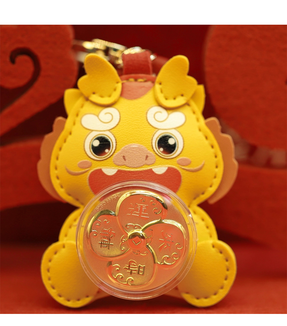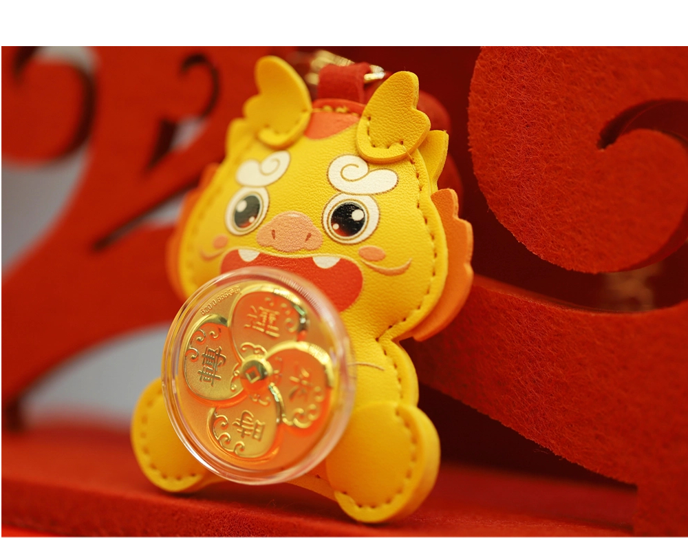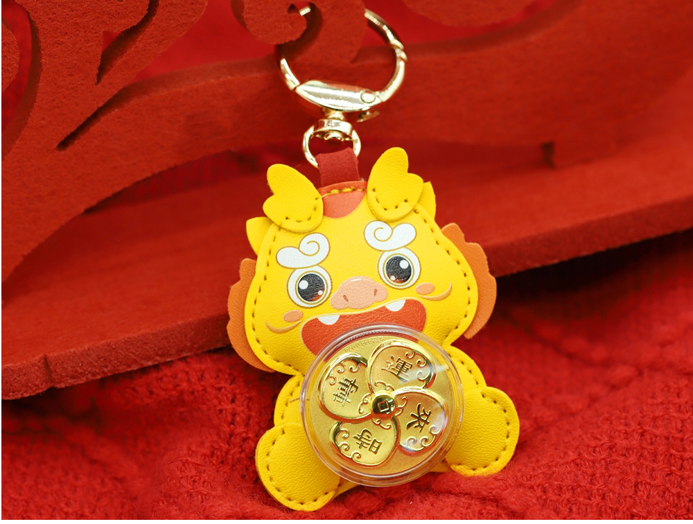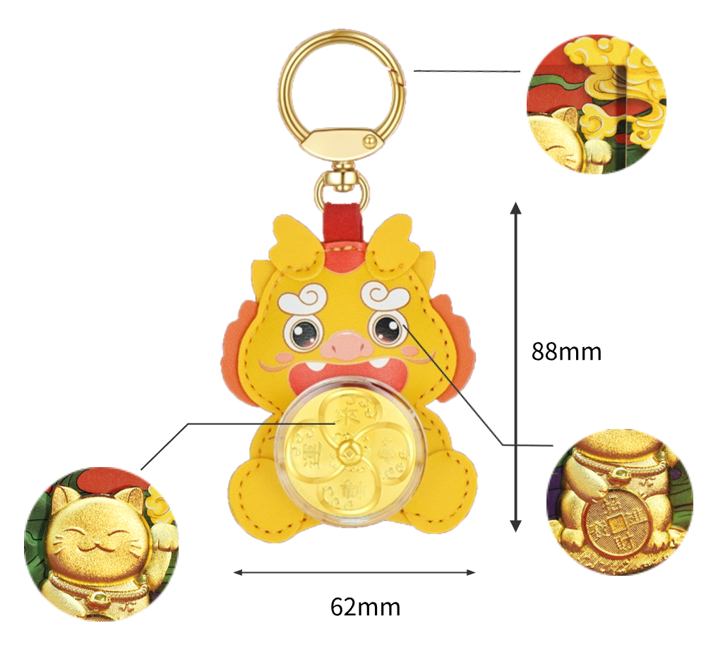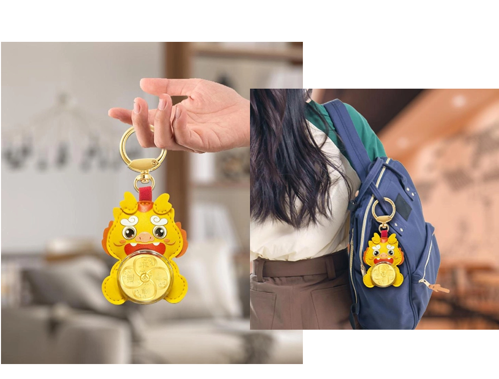 | Good luck comes, fortune rises, and fortune comes. This product is mainly in the shape of a little yellow dragon. The cartoon-style little yellow dragon is soft and cute, and the leather feels excellent. The small gold piece in the shape of a four-leaf clover is connected with a swivel bearing, combined with auspicious elements such as wave patterns, to create an art form that perfectly combines graphics and auspicious meanings, implying good luck and peace. | |
