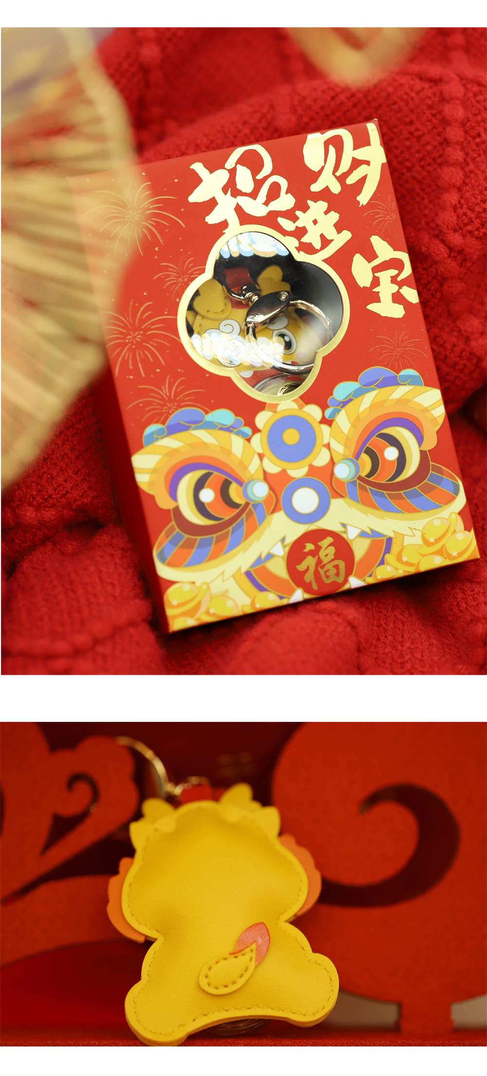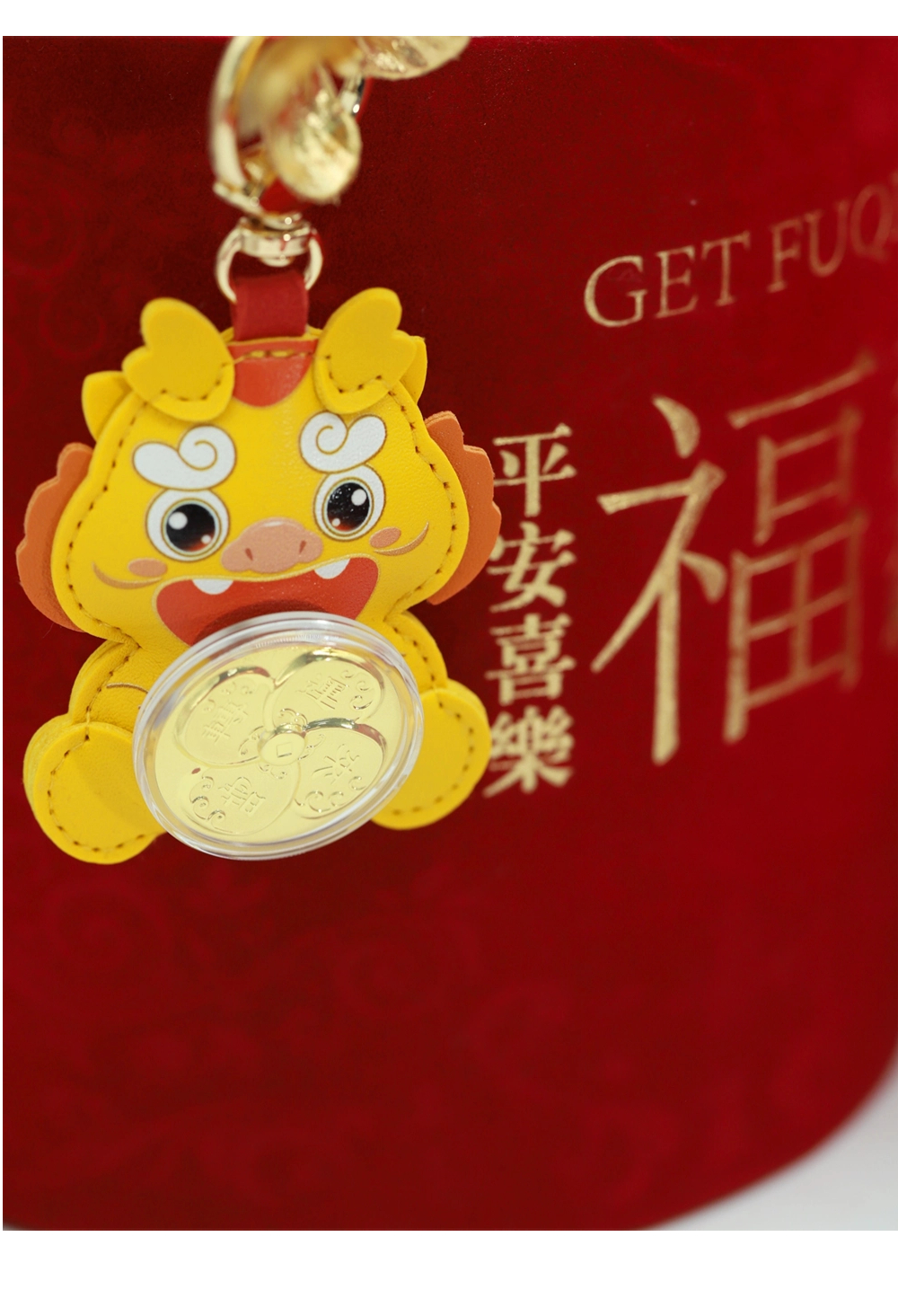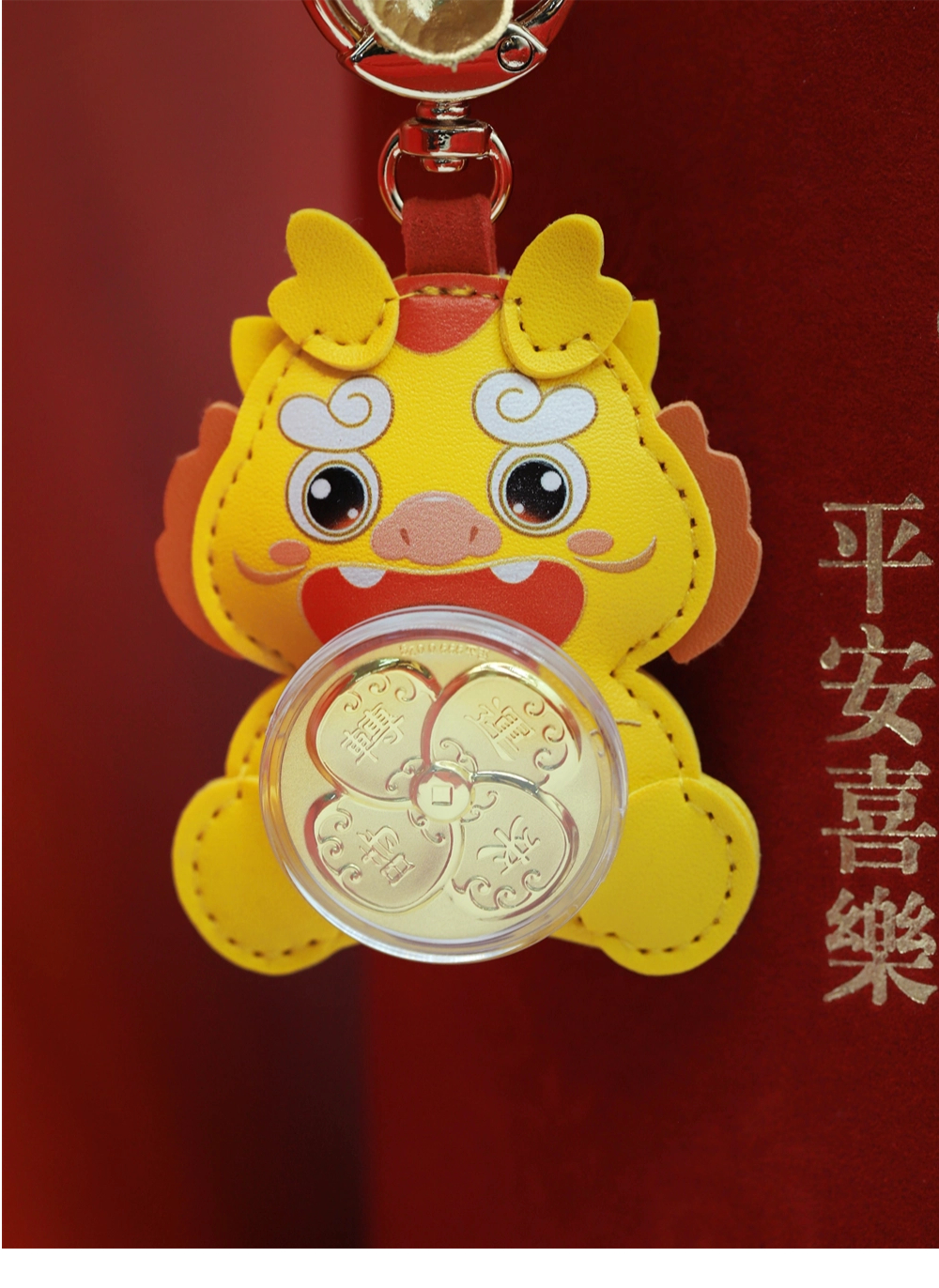 | Good luck comes, fortune rises, and fortune comes. This product is mainly in the shape of a little yellow dragon. The cartoon-style little yellow dragon is soft and cute, and the leather feels excellent. The small gold piece in the shape of a four-leaf clover is connected with a swivel bearing, combined with auspicious elements such as wave patterns, to create an art form that perfectly combines graphics and auspicious meanings, implying good luck and peace. | |