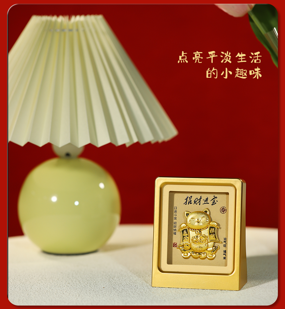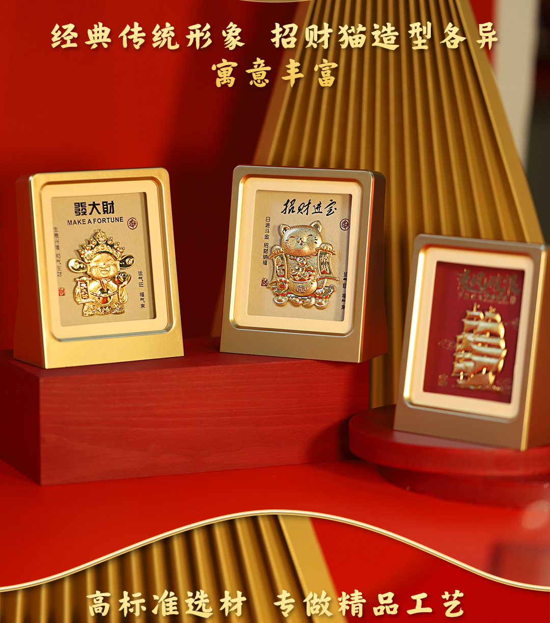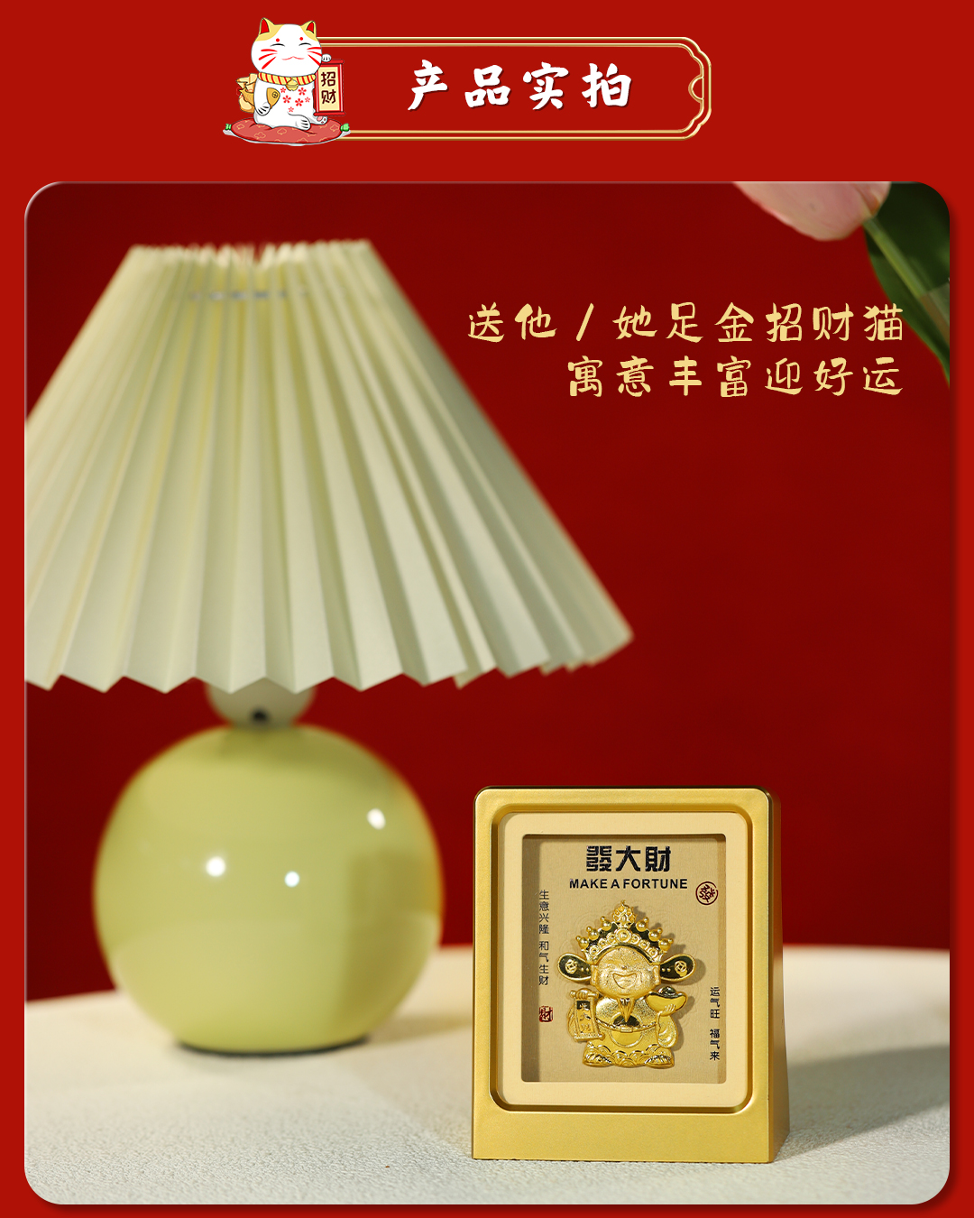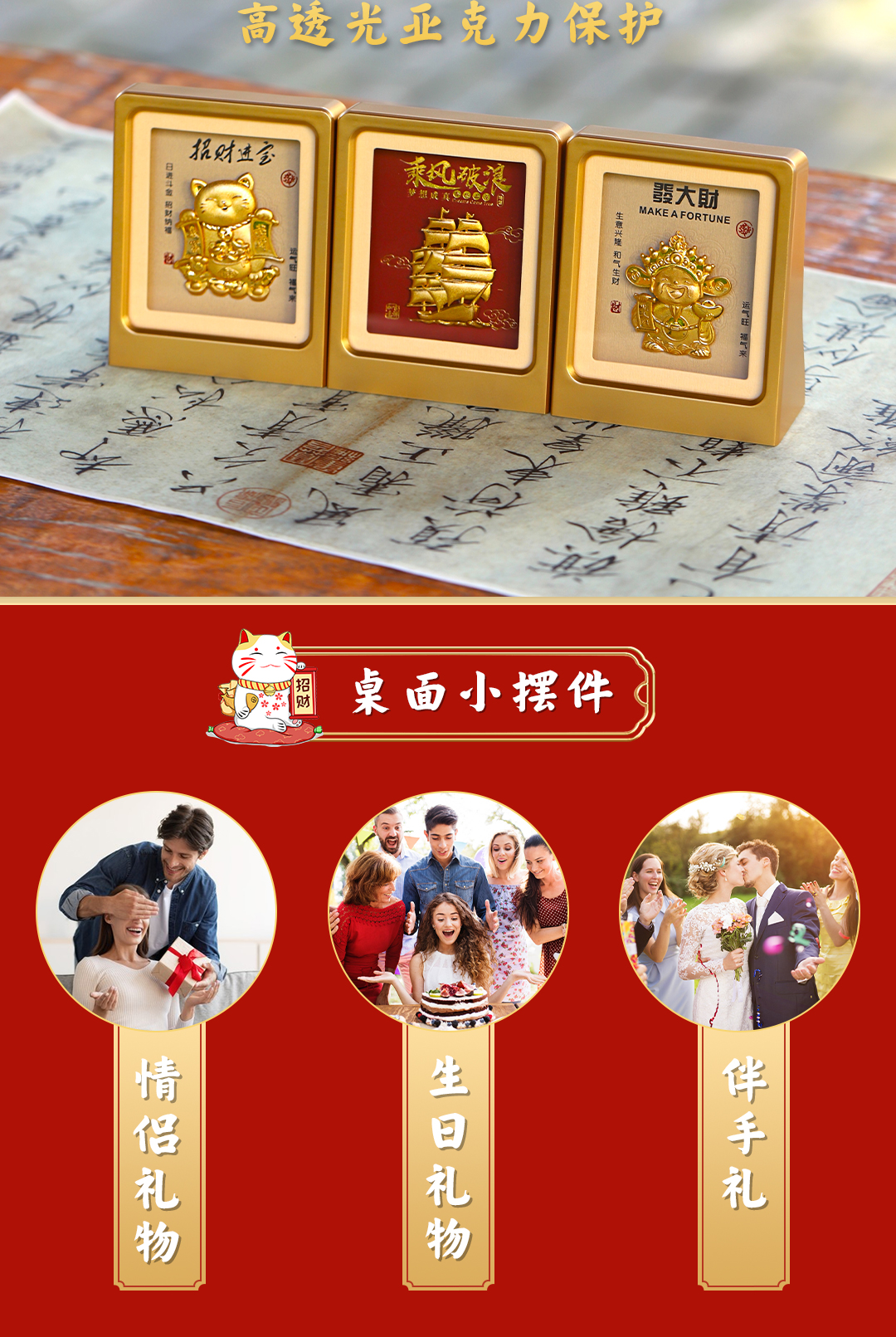| Three gold foil desktop decorations: "Lucky Cat" means to bring you wealth, "Riding the Wind and Waves" means smooth sailing, and "Here Comes the God of Wealth" means a lot of money. You can put it in your home study, TV cabinet or bedside table, or next to your computer in the office. With a beautiful tassel gift box, you can give it as a meeting gift or a casual gift to your relatives and friends. |