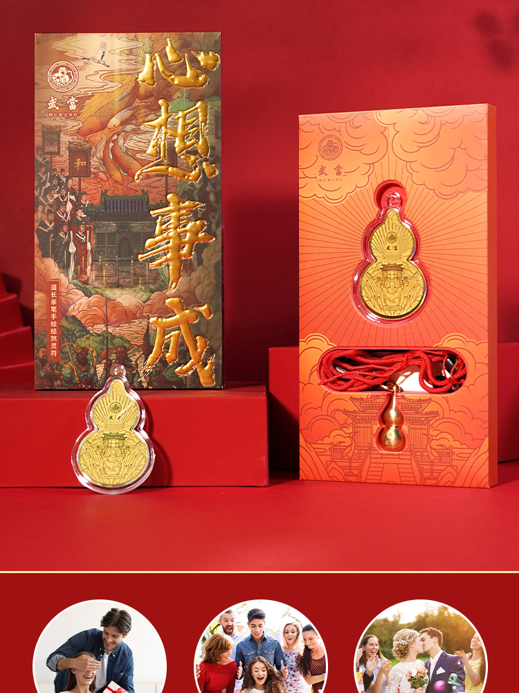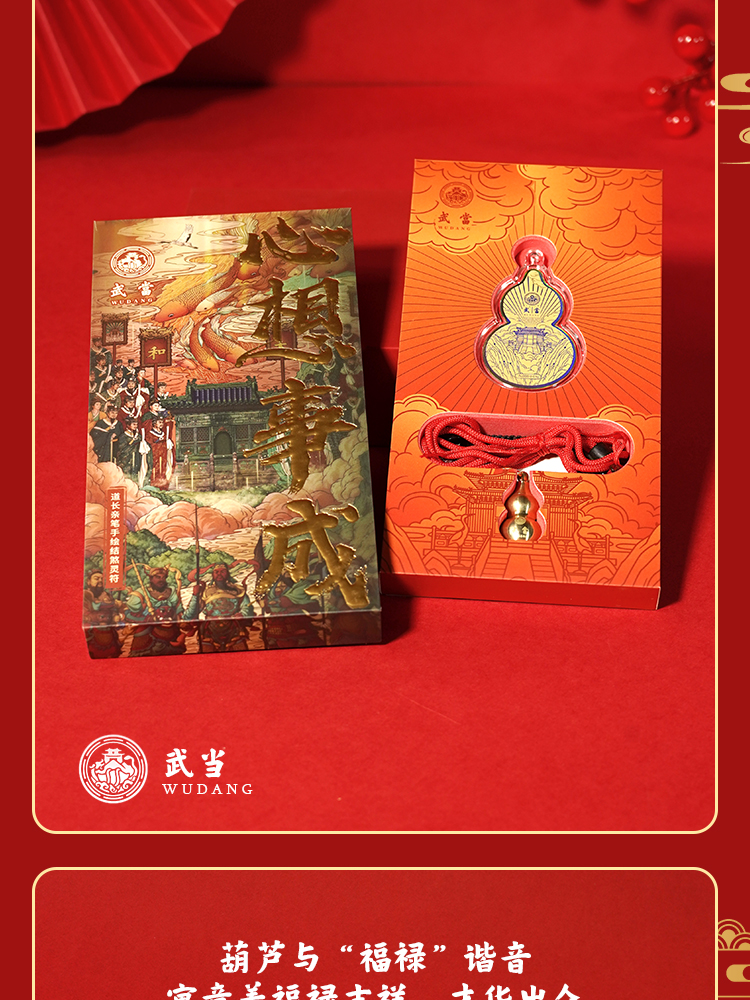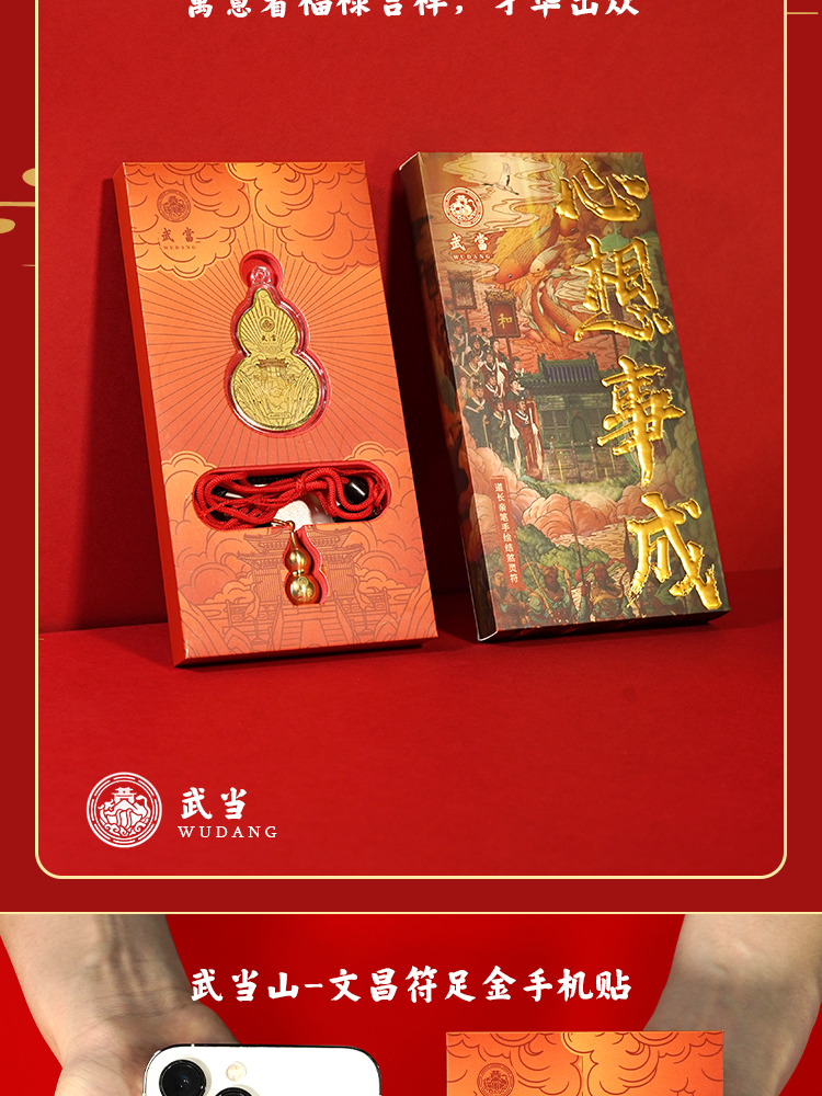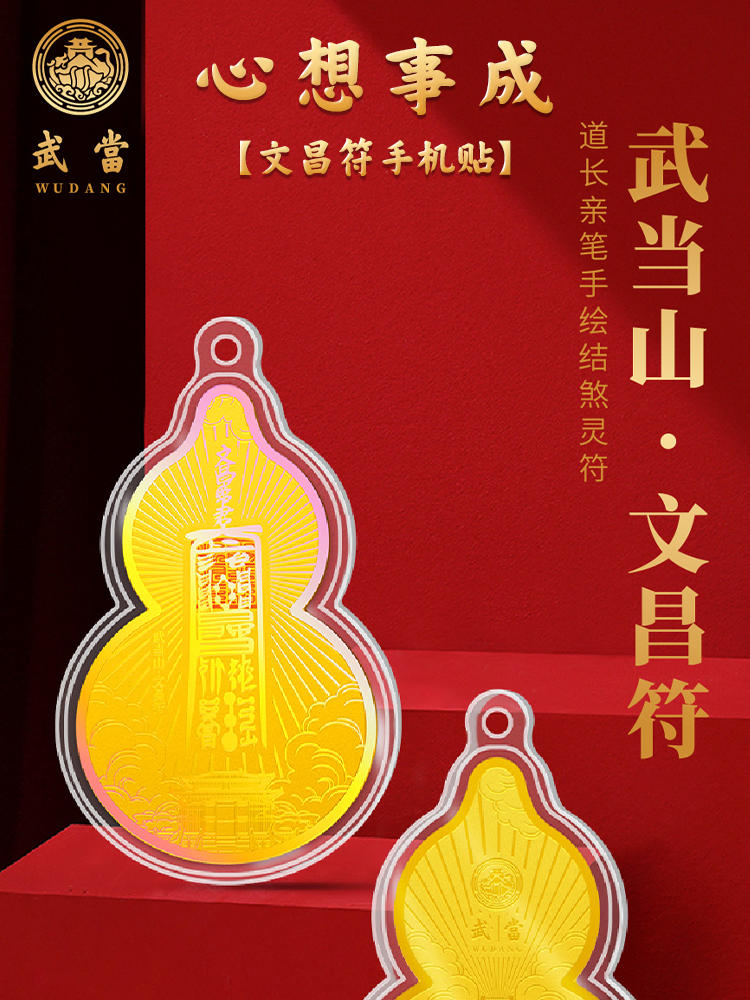 | The "May Your Wishes Come True" Wenchang Talisman pure gold sticker for mobile phones and iPads comes with a gourd decorative pendant with built-in Wudang Mountain Temple incense ash. It can be used as a key bag or car pendant, symbolizing good luck, peace and may your wishes come true. |