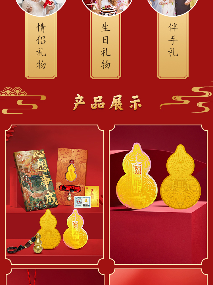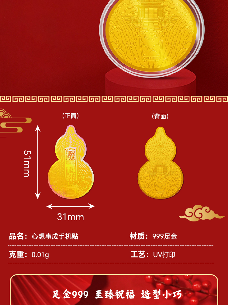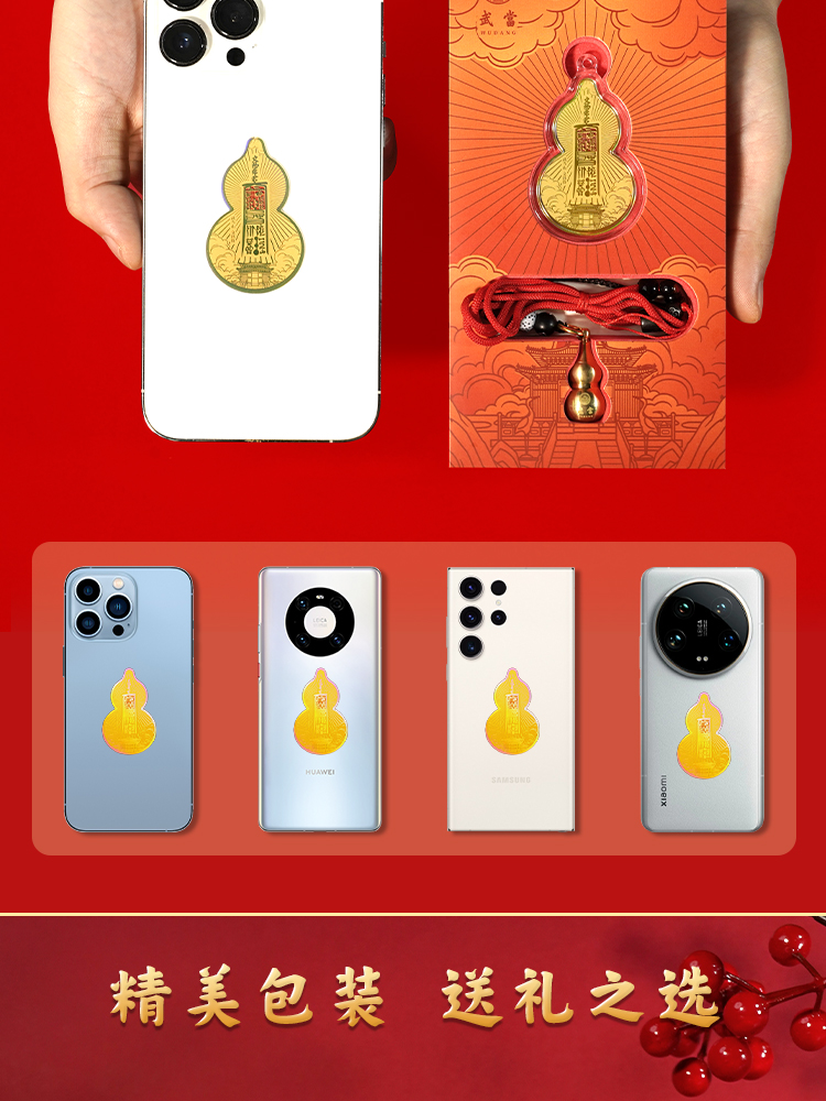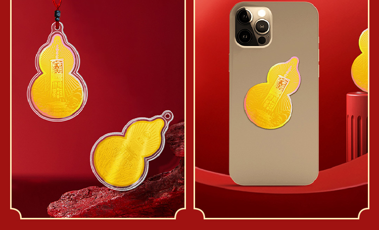 | Product accessories | 24KGold gourd mobile phone sticker*1,Acrylic protective cover*1,Copper gourd pendant*1,Quality inspection certificate*1, Packing box*1 |