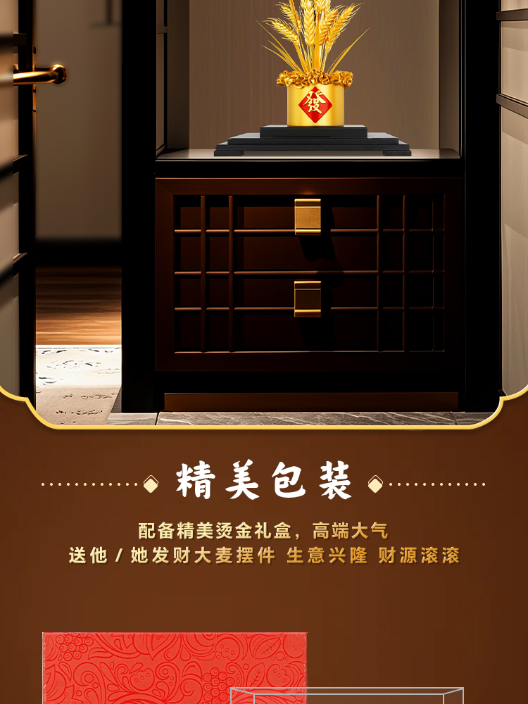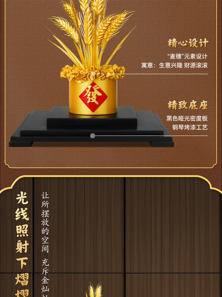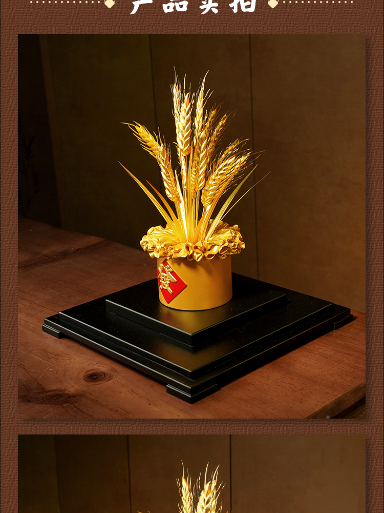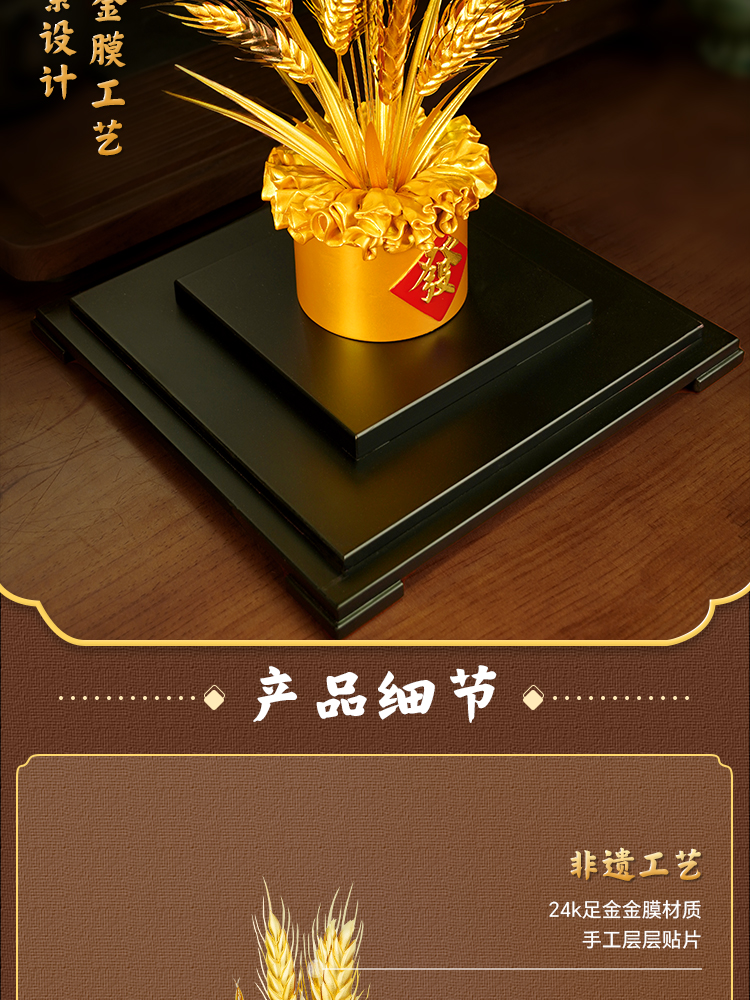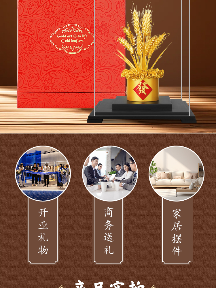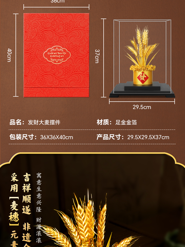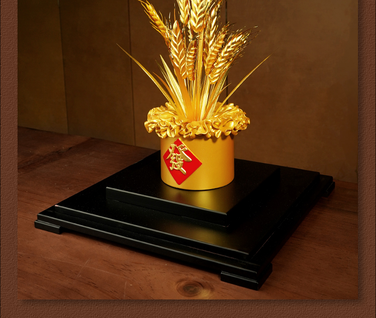 The wheat ears are handmade with pure gold foil, which can be placed for a long time without oxidation and fading. Barley is a mascot in Chinese culture. Its meaning and flower language represent peace and prosperity, good harvest, and booming business. In ancient times, there was a saying that "a good barley harvest means no hunger in the world", which means that a good barley harvest is closely related to the prosperity of the country and the food and clothing of the people. When the barley fruits are ripe, they are so abundant that the plants are pressed down, symbolizing the joy of the harvest of the working people. In addition, barley is homophonic with "big sale", so it is often used to symbolize prosperous business and rolling in wealth. Especially in commercial occasions such as opening ceremonies, the use of decorations such as barley flower baskets means that the new store will open with good luck and booming business. It also symbolizes peace and prosperity, good harvest, booming business, harvest, wealth, auspiciousness, prosperity and luck. |