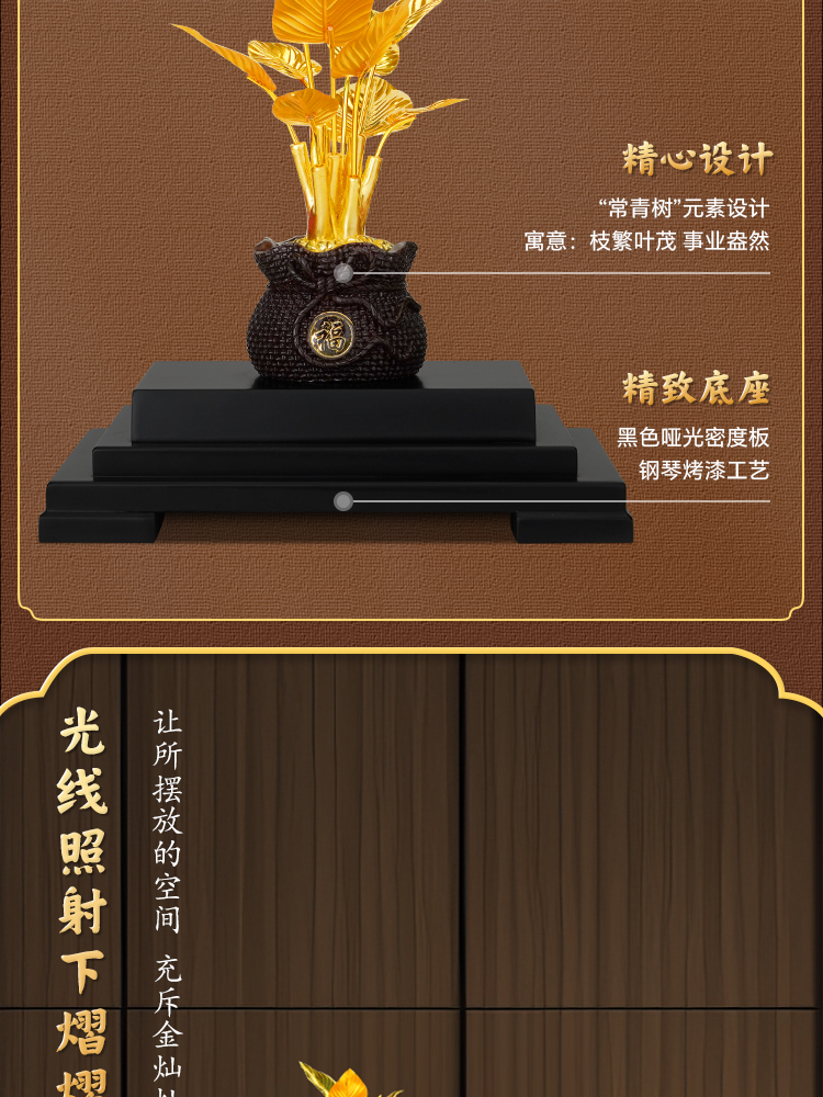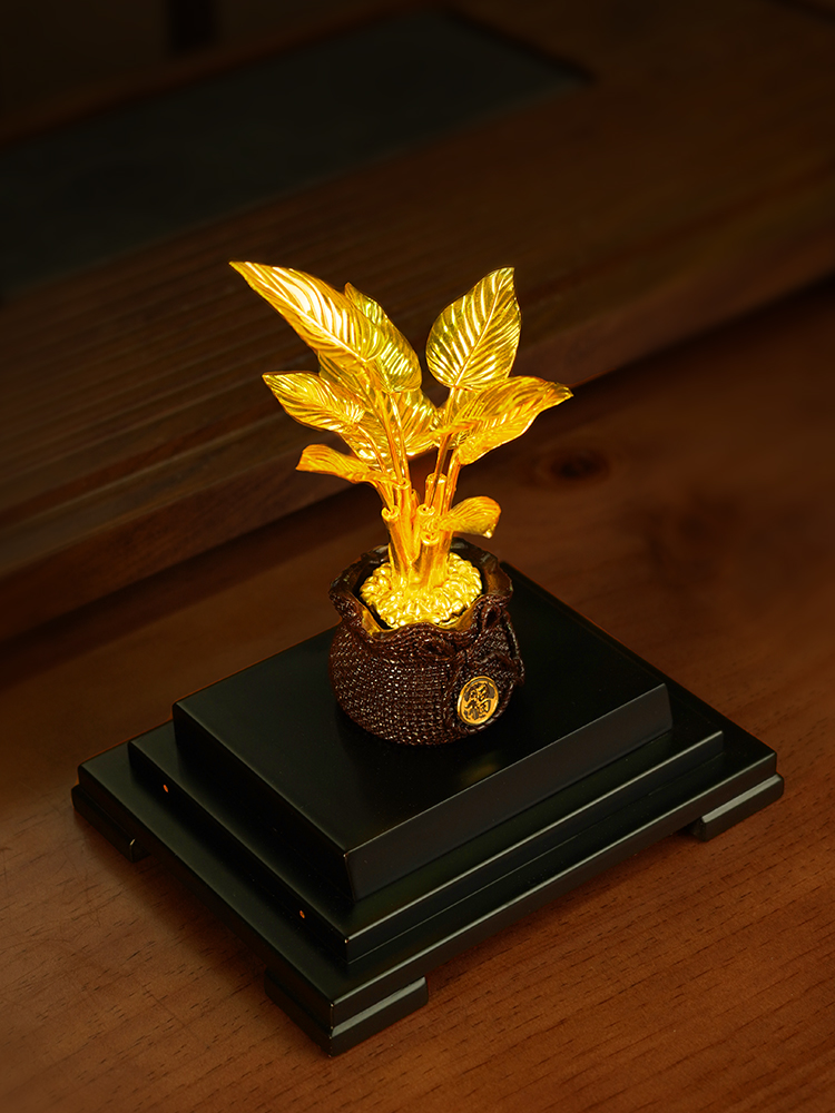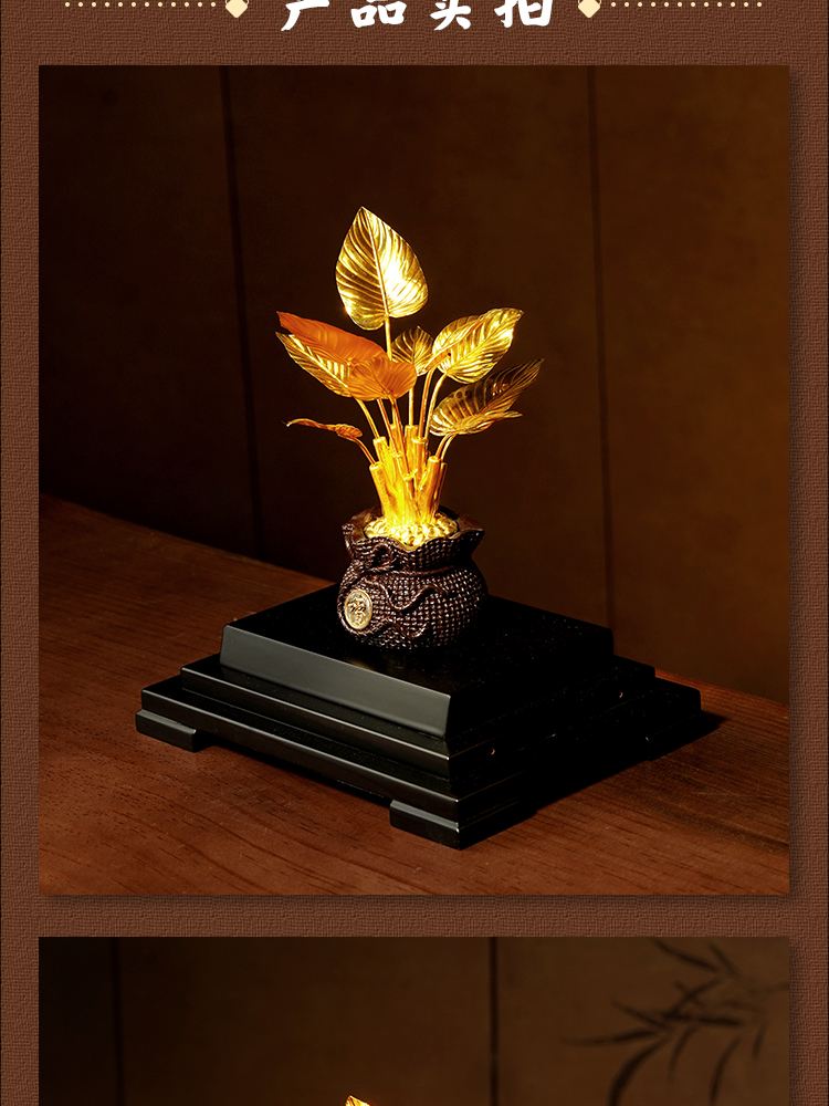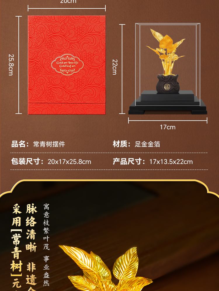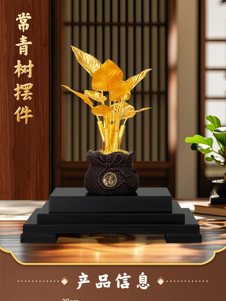 | Dieffenbachia itself is a plant with extremely strong vitality. It can survive in harsh environments and remain green, unaffected by the changes of seasons and the environment. Therefore, it is regarded as a symbol of auspiciousness and longevity in traditional Chinese culture. It is handmade with pure gold foil and can be placed for a long time without fading. Its name contains the meaning of "evergreen", symbolizing the vigorous and lasting vitality, auspiciousness, longevity, reunion and perseverance. It is often used in blessings and celebrations, such as weddings, birthdays, etc., implying blessings for the other party's longevity, happiness and good luck. |